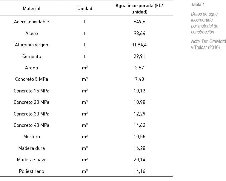 Con respecto al agua incorporada en la producción de edificaciones, McCormark et al. (2007) evaluaron diecisiete edificios no residenciales, en los que se evidencian distintos consumos por área edificada. En los resultados, el valor más bajo fue de 5 kL/m2, mientras que nueve casos presentaron valores similares con una media de 12 kL/m2; finalmente, el valor más alto fue de 20,1 kL/m2. En otro análisis de agua incorporada de una edificación con la misma tipología se encontró un valor superior de 54,1 kL/m2 (Crawford & Treloar, 2005). Mientras que en edificaciones residenciales el consumo de agua incorporada en los materiales utilizados durante las etapas de construcción, mantenimiento y reforma de una vivienda con más de cincuenta años de antigüedad puede ser equivalente a 31,3 kL/m2 de superficie construida (Crawford & Pullen, 2011).