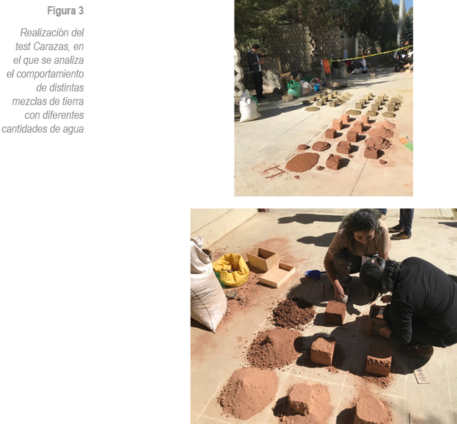 Un dato genérico indica que una mezcla óptima para edificar con tierra se encuentra en un rango de 30 a 35 % de agua en relación con un volumen seco de tierra (Neves & Borges, 2011). No obstante, el manejo y la durabilidad de los sistemas constructivos de tierra puede variar radicalmente si se les pone más o menos agua. Si se le incorpora alrededor de 35 %, adoptará un estado líquido; con 25 % tendrá una condición plástica que, si bien le permite fluir, será capaz de conservar su forma si se coloca en un molde. Sin embargo, si se intentara compactarla dentro de este, no se conseguiría densificarla, por ser demasiado dúctil. La tierra compactada para muros de tapia o para bloques de tierra comprimida (BTC) suele requerir solo 15 % de humedad (Guerrero, 2020). Véase la Figura 3.