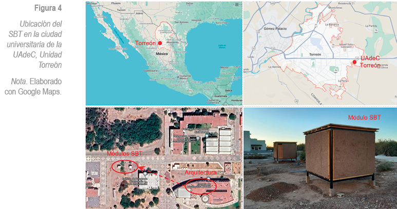 A partir de un análisis comparativo, que contempla la variable de agua incorporada, entre dos sistemas constructivos empleados para la edificación de un modelo de 10 m2 cada uno, se busca demostrar de manera cuantitativa la sostenibilidad hídrica de un sistema mixto denominado bajareque tecnificado (SBT), edificado en la Universidad Autónoma de Coahuila (UAdeC), Unidad Torreón, México. La propuesta reinterpreta la técnica tradicional de bajareque o quincha, con entramados de tierra-madera, incorporando en menor medida acero y concreto en sus componentes estructurales y en la cimentación. Los datos de este modelo se compararon con los de otro modelo de las mismas dimensiones, pero con un sistema constructivo convencional (SCC) de amplio uso en esta región de Coahuila, que emplea concreto, poliestireno y acero como materiales de construcción. En la Figura 4, se muestra la ubicación del módulo de SBT en un terreno colindante con la Escuela de Arquitectura, en la Ciudad Universitaria de la UAdeC, Unidad Torreón.