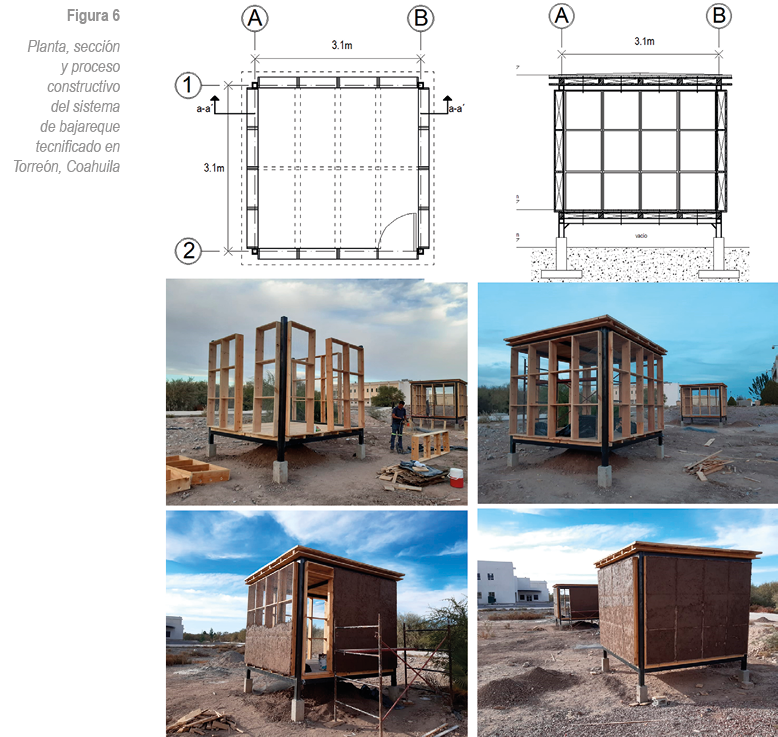 En la Figura 6, se muestran las características espaciales y constructivas del sistema de bajareque tecnificado. También se visualiza parte del proceso constructivo: levantamiento de estructura metálica, colocación de paneles de madera para muros, aplicación del primer revoque sobre los muros y finalización de la obra.