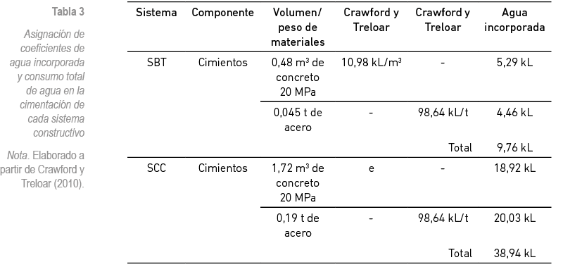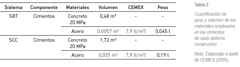 En la Tabla 2, se observa un ejemplo de la cuantificación de volumen y peso de los materiales empleados en la cimentación del SBT y del SCC. El manejo de los datos en la tabla se ajusta con la unidad de medida requerida para la asignación de los coeficientes de agua incorporada en kilolitros por volumen de material (kL/m3) y en kilolitros por peso de material (kL/t).