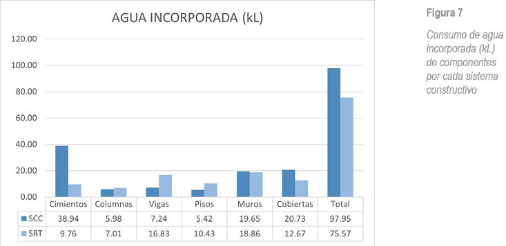 El agua incorporada de los muros del SCC es de 19,65 kL, mientras que la del SBT en el mismo componente es de 18,86 kL. Los datos indican que los muros del segundo sistema consumen un poco menos de agua en comparación con los del primero, con una diferencia de 0,79 kL, que representa –4 %.