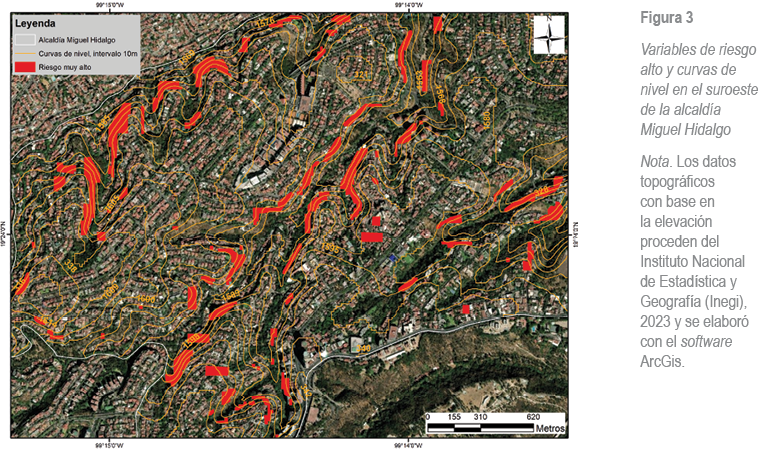 Para una mejor comprensión del riesgo derivado de la pendiente, se realizó el cruce de la información contenida en la Actualización del Atlas de Riesgos Naturales de la Alcaldía Miguel Hidalgo (2018) con la topografía del lugar (Figura 3). Esta última fue obtenida a partir de imágenes en formato ráster de la CDMX, disponibles —por ser información pública— en la página electrónica del Instituto Nacional de Estadística y Geografía, con una resolución de quince metros, a partir de las cuales se generaron curvas de nivel cada diez metros.