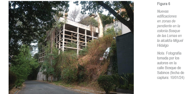 Para ratificar lo expuesto, se realizó trabajo de campo en la calle Bosque de Sabinos, ubicada en la colonia Bosque de las Lomas en la alcaldía Miguel Hidalgo. Según la cartografía del presente análisis, sus edificaciones en zonas de pendiente presentan diversos niveles de riesgo (Figura 5).