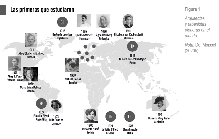 Para Moisset (2020a), arquitecta e investigadora argentina: “El canon arquitectónico ha estado formado básicamente por arquitectos varones, que desarrollaron sus obras en sitios centrales. Así tienen predominio también quienes trabajaron en la capital, por sobre los que se desempeñaron en las provincias” (p. 220). Su investigación “Vacíos historiográficos. La ausencia de las mujeres en la historia de la arquitectura argentina” identifica las seis principales categorías de invisibilización de las mujeres en la profesión: (1) la negación de la autoría por colegas hombres, (2) el impedimento por instrumentos legales de firmar las obras, (3) la falsa categorización (en caso de esposas o clientes de arquitectos reducidas a esos papeles y sin crédito a su contribución técnica), (4) la minimización de los aportes (citando coautoras solo como colaboradoras), (5) el reforzamiento de estereotipos de género (que llevan a las mujeres a adoptar posturas masculinas para afirmarse) y (6) la mala fe (apropiación de proyectos de mujeres por hombres) (Moisset, 2020a).