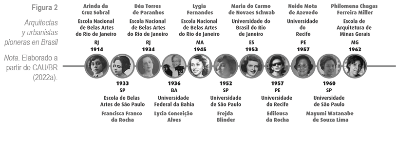 6 A principios del siglo xx, las primeras instituciones educativas destinadas a la formación de arquitectos tuvieron su origen en la Escuela Nacional de Bellas Artes (ENBA) de Río de Janeiro, que ya venía formando ingenieros-arquitectos desde 1899. Única mujer en su clase, la primera ingeniera-arquitecta de Brasil —y muy probablemente de América Latina—, Arinda da Cruz Sobral, concluyó sus estudios en la ENBA en 1914 (CAU/BR, 2022b), siendo sucedida en 1923 por Julia Guarino en Uruguay y en 1927 por Filandia Pizzul en Argentina (Moisset 2020a).