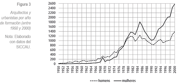 La presencia mayoritaria de mujeres en las carreras de arquitectura desde la década de 1980, así como la Ley de Cuotas Raciales para la Educación Superior (Lei 12.711, 2012) y la Ley Brasileña para la Inclusión de Personas con Discapacidad (Lei 13.146, 2015), reflejan las subvenciones para acciones inclusivas que permean todos los ámbitos de la profesión, promoviendo una diversificación del perfil de los profesionales y, en consecuencia, la democratización de la producción arquitectónica y urbana. Las raras existencias femeninas en la profesión hasta los años setenta jamás encontraron condiciones análogas a las de los colegas, pero siguieron infiltrándose hasta alcanzar un contingente numérico relevante en la profesión (Figura 3).