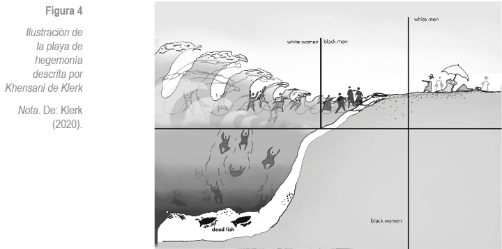 En su artículo “El pez muerto en la playa: el problema de las mujeres en la arquitectura”, la arquitecta sudafricana Khensani de Klerk (2020) trae la lectura interseccional al ejercicio profesional, considerando aspectos como representatividad y remuneración. Por medio de una metáfora entre la profesión y una playa, denominada por ella “la playa de la hegemonía” (véase la Figura 4), describe lo siguiente: