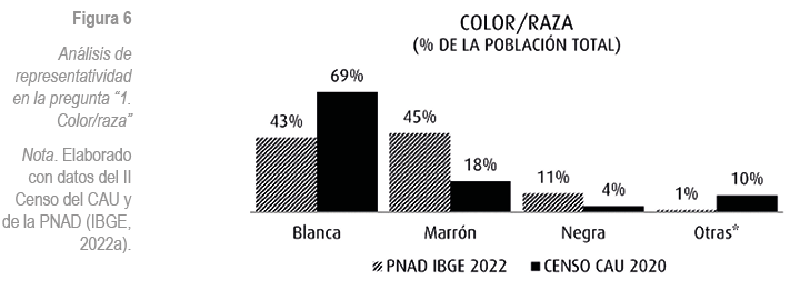 Más de cien años de profesión y todavía se observa que la población blanca es mayoritaria, un 26 % superior a la del PNAD del IBGE. Por otro lado, la población negra está subrepresentada con relación a las proporciones del país, pues los pardos representan un 28 % menos y los negros un 7 % menos que los porcentajes de la población brasileña. En el libro Se a cidade fosse nossa, la arquitecta y urbanista Joice Berth (2023) relata fracasos de gestores públicos en la conducción de las ciudades, causados por la incomprensión de los reales problemas urbanos, que son fruto de nuestra herencia esclavista. Para Berth, hablar de racismo urbano como una modalidad subyacente de la opresión racial brasileña es nombrar un problema histórico.