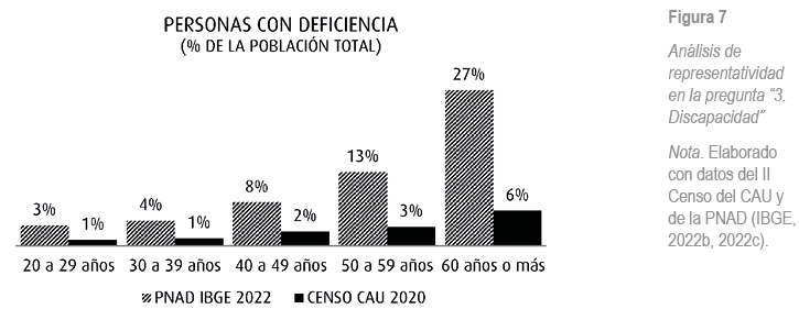 Para el análisis de la pregunta “3. Discapacidad”, ilustrada en la Figura 7, hemos organizado la información recopilada por edad para ilustrar la relación entre la discapacidad y el proceso natural de envejecimiento. Para minimizar las desviaciones debidas a las imprecisiones de la recolección, nos restringimos a identificar el porcentaje de personas con discapacidad, cualquiera que fuera, con relación al total de la población de aquel intervalo de edad, tanto en el II Censo del CAU como en la PNAD Continua.