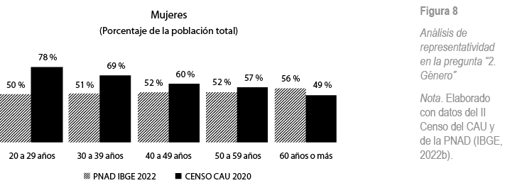 En esta comparación (Figura 8), es perceptible la sobrerrepresentación femenina en el CAU, en particular en los grupos de edad más jóvenes. Las mujeres llegan a representar un porcentaje 28 % superior al de la PNAD en la franja entre 20 y 29 años. Mientras en la sociedad brasileña los índices se mantienen relativamente constantes, en el CAU esa proporción es cada vez más relevante. Así, se entiende que equiparar la participación masculina en la profesión es también una política afirmativa pertinente para la democratización del ejercicio de la arquitectura y del urbanismo.