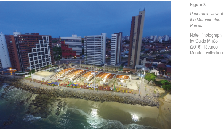 The production of contemporary architecture in Fortaleza is largely related to productive and socio-spatial restructuring processes that have taken place in Ceará since the 1990s, with tourism playing an important role in integrating the city into global economic flows. In this context, the State has increasingly promoted large-scale urban interventions and the construction of facilities aimed at enhancing productivity, competitiveness, to boost the city’s image. One such project is the Mercado dos Peixes (2011–2016), the first building developed under the Avenida Beira-Mar redevelopment project along Ceará’s capital coastline. The facility houses 45 stalls for fish sales and provides restaurant services for tourists and locals, strategically located on the city’s tourist waterfront.