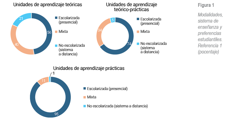 Un poco más de la mitad (56 %) prefiere la modalidad escolarizada (presencial) para el estudio de los contenidos teóricos; el 40 %, la modalidad mixta; mientras que una quinta, la modalidad no escolarizada (sistema a distancia).