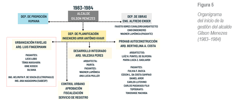 Entre los designados estaba Amir Antônio Khair2, a cargo del Departamento de Planeamiento, central en las iniciativas de la gestión. Khair convocó a especialistas para coordinar temas específicos, como Luis Fingermann3, encargado del programa de urbanización de favelas, y Berthelina Alves Costa4, líder del Programa de Vivienda Popular Autoconstrucción, orientado a la asistencia técnica habitacional.