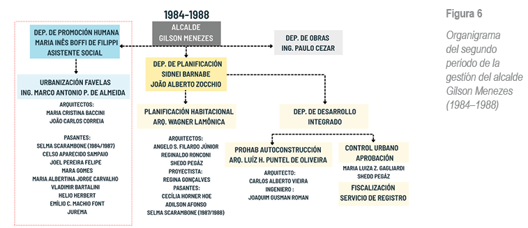 A mediados de 1984, se constituyó un nuevo equipo de urbanización de favelas, vinculado al Departamento de Promoción Humana hasta el final de la gestión de Menezes, en 1988 (Figura 7). Este departamento tenía la responsabilidad de brindar asistencia social a toda la población, con un enfoque especial en los residentes de las favelas.