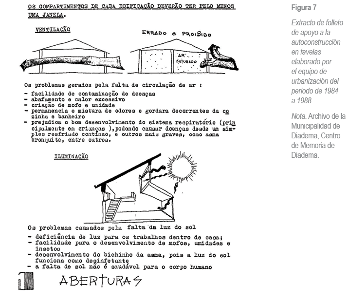 Sobre el tema de la asistencia técnica para la vivienda de interés social descrito en el ítem 6, se evidenció que no se realizaba un trabajo riguroso en la elaboración de proyectos que atendieran las particularidades de las familias. Esta cuestión no era una de las principales demandas de los residentes de áreas ocupadas irregularmente, quienes priorizaban el acceso a servicios públicos básicos y el derecho a la tierra urbana. Las orientaciones se ofrecían principalmente a través de folletos (Figura 8), que abordaban aspectos como la definición de aberturas para garantizar iluminación y ventilación, distancias mínimas entre edificaciones y la creación de espacios para instalaciones de conexión con la red pública.