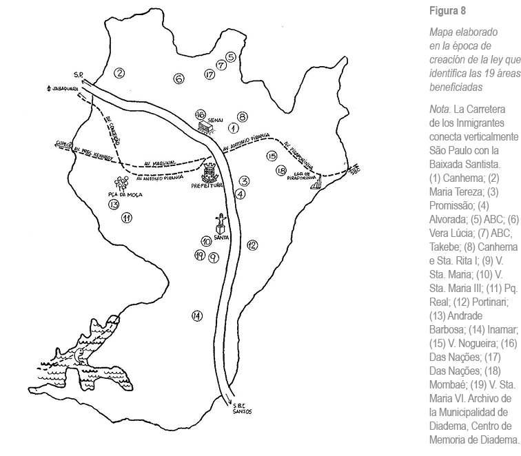 Con la construcción de la Carretera de los Inmigrantes a principios de la década de 1970, Diadema entró en una nueva fase de desarrollo industrial, resultando en un aumento significativo de la migración en busca de empleo y en la valorización del mercado de tierras. Sin embargo, la creación de lotes para la población de bajos ingresos enfrentó limitaciones debido a la valorización de la tierra y a la falta de áreas residenciales y normas en el Plan Director. Esta situación se evidencia en los planos directores de 1969 y 1973, que muestran que la planificación formal no correspondía a la realidad urbana, que se expandía al margen de la ley (Lobo Júnior, 2014, p. 31).