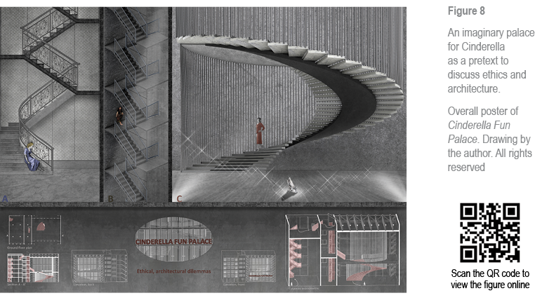 In the case of “ethics,” for example, the project is spun from the story of Cinderella—a tale of social descent and ascent, whose turning point takes place on a staircase. The project imagines a palace with three different staircases, each representing a significant rise or fall in Cinderella’s life: an archetype who loses everything only to gain the world, transitioning from her upper-class childhood to an enslaved adolescence, and ultimately to royal ascension. Each staircase incorporates architectural features that symbolically reflect its corresponding life stage. The discussion starts with the hypothesis that an aging Queen Cinderella has commissioned the palace to commemorate the anniversary of her despotic reign—something that, in real life, might resemble an autocracy. The palace is conceived as a monumental, functionless box. This leads to a provocative question: Should such a commission pose an ethical problem for the architect?