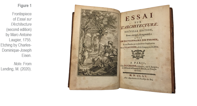 Among the architectural thinkers at the dawn of modernity is the French Marc-Antoine Laugier, who in 1753 published his Essai sur l’Architecture (Laugier, 1753). Laugier never practiced as an architect, with the exception of a consultancy for the design of the choir in the Cathedral of Amiens. When writing about architecture, he was thus not seeking commissions or attempting to establish a social status for himself, since he was already a high-ranking ecclesiastic. In his reflections on architecture, he offered readers guiding principles rather than examples of how to design buildings.