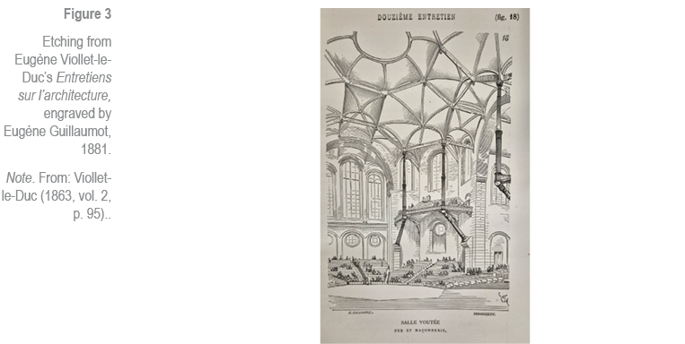The success of Entretiens sur l’architecture was not unrelated to the fame of its author, a prominent public character during the Second Empire, but it was the iconography that played a crucial role in the book’s diffusion. Among the out-of-text images are some architectural fantasies of public buildings that combine iron frameworks and stone vaults. Viollet-le-Duc exerted significant influence on architecture thanks to these fantasies, even before his texts were translated into other languages, as the prominent English architect William Burges testified: “We all cribbed on Viollet-le-Duc even though no one could read French” (“Eugène Viollet-le-Duc,” 2024).