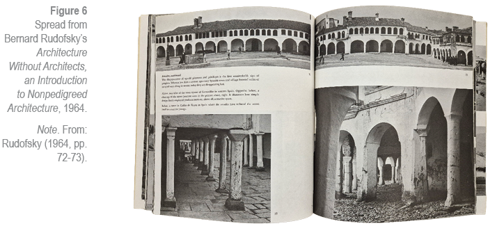 When, in the early 1960s, divergent positions started to emerge beyond the modern masters such as Le Corbusier and Gropius, much of the confrontation was conducted through colliding iconographies. A blatant example in this regard is Bernard Rudofsky’s Architecture Without Architects: A Short Introduction to Non-Pedigreed Architecture, the catalogue of an exhibition held at the Museum of Modern Art (MoMA) in 1964–1965 and, as such, deeply visual in nature (Rudofsky, 1964). The book comprises 156 pages in an almost square format (240 × 215 mm) and contains 156 pages and 156 images, black-and-white photographs, with nine drawings. The images are large and dominate the layout of all pages, while the text consists of extended captions. The photographs themselves form the argument and, as the author states, are the output of lifelong research. They depict buildings and towns in rural contexts, many outside Europe and North America, all of which are non-authored.