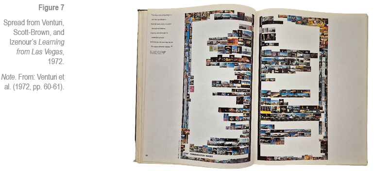 Less than a decade later, another blatant iconographic opposition to architectural specialization appeared: Learning from Las Vegas by Venturi, Scott Brown, and Izenour (Venturi et al., 1972). Its large format (355 × 265 mm) supports Muriel Cooper’s layout, which is designed around the extensive iconography of Las Vegas streets, accompanied by analytical sketches by the authors. It is now almost a cliché to describe Learning from Las Vegas as a milestone in the twentieth-century architectural literature; however, it is still worth emphasizing that the book emerged from the authors’ academic work, specifically a graduate research studio at Yale. Yet, because its visual arguments consist of photos and sketches, Learning from Las Vegas does not require specialized architectural training to be understood, despite the complexity of its arguments and regardless of whether one agrees with its conclusions.