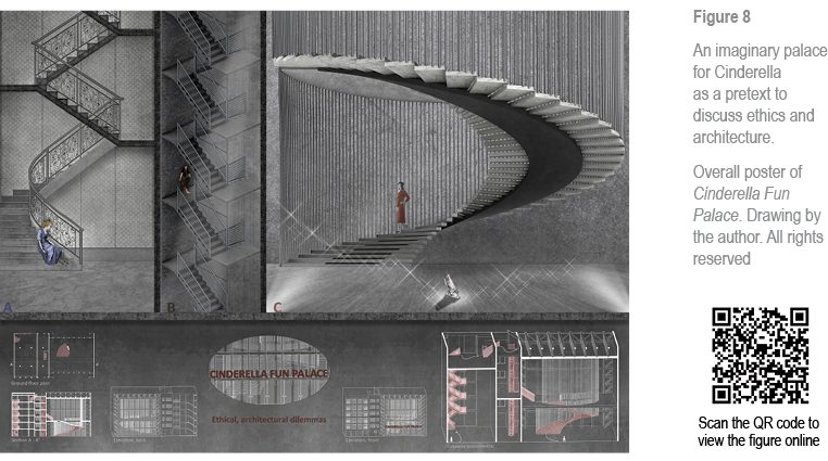 In the case of “ethics,” for example, the project is spun from the story of Cinderella—a tale of social descent and ascent, whose turning point takes place on a staircase. The project imagines a palace with three different staircases, each representing a significant rise or fall in Cinderella’s life: an archetype who loses everything only to gain the world, transitioning from her upper-class childhood to an enslaved adolescence, and ultimately to royal ascension. Each staircase incorporates architectural features that symbolically reflect its corresponding life stage. The discussion starts with the hypothesis that an aging Queen Cinderella has commissioned the palace to commemorate the anniversary of her despotic reign—something that, in real life, might resemble an autocracy. The palace is conceived as a monumental, functionless box. This leads to a provocative question: Should such a commission pose an ethical problem for the architect?