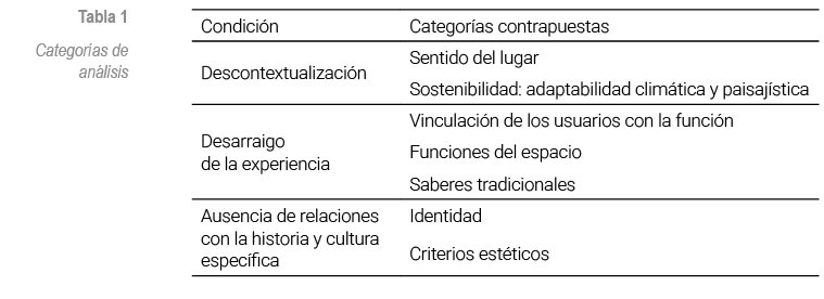 Los elementos significativos de la globalización ya mencionados —descontextualización, desarraigo de la experiencia, ausencia de relaciones con la historia y la cultura específica— nos permiten plantear las categorías de análisis sobre cuya base se revisarán obras de arquitectura mexicana (dos equipamientos educativos, un refugio para mujeres víctimas de violencia y un centro de rehabilitación e inclusión infantil), a fin de examinar si, a través de la contextualización, pueden obtenerse productos arquitectónicos que no solo atiendan el sentido del lugar, sino que reflejen su ética y estética. En la Tabla 1, podemos observar que las categorías definidas, en oposición a la descontextualización, fueron el sentido de lugar, la sostenibilidad (en específico, las adaptabilidades climática y paisajística). En contraposición al desarraigo, se definieron como categorías la vinculación de los usuarios, las funciones del espacio y los saberes tradicionales. En el caso de la ausencia de relaciones con la historia y la cultura, las categorías son la identidad y los criterios estéticos.