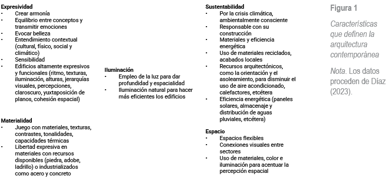 A partir de los conceptos anteriores, las características que se definen para identificar la arquitectura contemporánea son la expresividad, la materialidad, la iluminación, la sustentabilidad y el espacio. Respecto de la expresividad, se plantea analizar el equilibrio entre conceptos y emociones, la belleza, el entendimiento contextual (cultural, físico, social y climático) y la sensibilidad (ritmo, textura, iluminación, alturas, jerarquías visuales, percepciones, claroscuros, yuxtaposición de planos, armonía y cohesión espacial, entre otros), con el objetivo de valorar si la edificación es altamente expresiva y funcional (Díaz, 2023).
