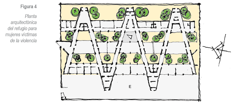 El inmueble se desarrolla en una planta arquitectónica que articula tres crujías ortogonales separadas por jardines longitudinales a cielo abierto, en donde la relación con la naturaleza, el sol y la lluvia busca una experiencia sensorial y una atmósfera estimulante de restauración emocional. Las crujías están atravesadas por circulaciones diagonales continuas que, además de generar espacios flexibles, proporciona al lugar una percepción abstracta de los espacios; es decir, es una arquitectura, que no solo diluye la estructura formal y reduce la sensación de aislamiento, sino que busca crear un ambiente seguro, flexible y dinámico, con espacios que fomentan la integración social y el apoyo mutuo entre las mujeres residentes (véase la Figura 4).