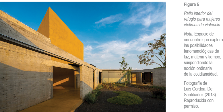 La interacción de estos dos sistemas formales genera un entramado constructivo y espacial compuesto por planos orientados en distintos sentidos, que se adapta a las condiciones culturales, sociales y climáticas de la región, y refleja la identidad local en sus formas y materiales. Con un diseño de bajo mantenimiento, el uso de materiales endémicos y un enfoque respetuoso del espíritu liberal, el refugio integra el paisaje y sus componentes contextuales como elementos fundamentales de su estructura. El edificio, además de su función de resguardo, cumple una función educativa como centro de sensibilización sobre la violencia de género. De esta manera, el proyecto no solo ofrece protección, sino que también contribuye a la construcción de una sociedad más equitativa y resiliente. A través de su enfoque de sostenibilidad, inclusión social, conexión con la naturaleza y adaptación al contexto local, el refugio no solo garantiza seguridad, sino que también favorece un cambio social significativo (véase la Figura 5).