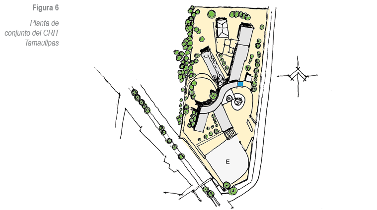 El CRIT de Tamaulipas consta de seis edificios conectados por una galería curva que, además de formar un juego armónico de volúmenes, incorpora elementos innovadores en el manejo de formas expresivas y sistemas constructivos con materiales locales, lo que permite una integración respetuosa con el entorno y el medioambiente. El uso del color es fundamental, ya que busca crear una atmósfera lúdica donde los niños participen activamente en su proceso de rehabilitación (véase la Figura 6).