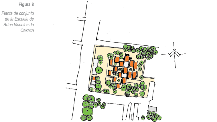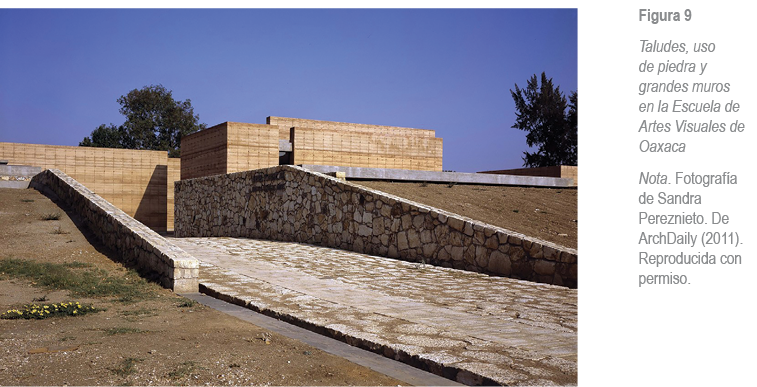 Oaxaca es una ciudad mexicana ubicada entre tres valles fluviales localizados entre el nudo mixteco, la Sierra Juárez y la Sierra Madre del sur. Es un centro cultural importante que tiene como antecedente haber sido de una de las regiones culturalmente más avanzadas a la llegada de los españoles. Tiene condiciones climáticas que oscilan entre un clima subtropical de tierras altas y un clima de montaña, lo cual implica variaciones climáticas importantes (entre los 25 °C y los 32 °C). Uno de los proyectos más emblemáticos de la ciudad es la Escuela de Artes Visuales, diseñada por el arquitecto mexicano Mauricio Rocha y caracterizada por su enfoque en la sostenibilidad. El diseño aprovecha las características naturales del entorno para crear espacios agradables y funcionales. Consta de dos tipos de edificios: uno que está construido en piedra, que conserva los taludes de tierra y crea terrazas útiles; y el otro, independiente de los bancales, que está orientado hacia el norte. La disposición de los volúmenes geométricos genera un juego estético de llenos y vacíos, puntos de fuga y sombras (véanse las figuras 8 y 9).