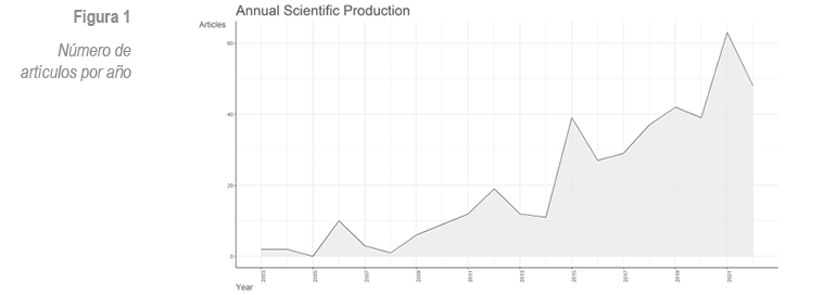 Donde el valor inicial es el número de artículos en 2003 (2), el valor final es el número de artículos en 2022 (48) y “n” es el número de años entre 2003 y 2022 (19). Sustituyendo estos valores, se obtiene una CAGR de aproximadamente 22,28 % (Figura 1).
