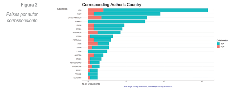 Estados Unidos lidera la producción científica con 63 artículos, de los cuales 55 son de autores nacionales y 8 son obra de colaboraciones internacionales. Italia ocupa el segundo lugar con 38 artículos (35 nacionales y 3 en colaboración), seguido del Reino Unido con 31 publicaciones (24 nacionales y 7 en colaboración). Turquía destaca con 30 artículos, todos de producción interna, un patrón que también se observa en países como Chile y Francia, donde la producción es mayormente local, lo que limita su conexión con la comunidad científica global.