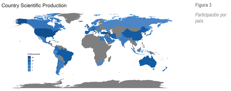 En términos de citaciones (Figuras 3 y 4), Estados Unidos lidera con 321 citas y un promedio de 5,10 citas por artículo. Sin embargo, Australia (8,24) y Nueva Zelanda (12,83) muestran un mayor impacto por publicación. Los Países Bajos, con 31 citas por artículo, destacan como una fuente altamente influyente pese a su menor volumen de publicaciones. La distribución geográfica de las publicaciones es desigual, con una clara concentración de la producción científica en Norteamérica, Europa occidental y Asia oriental, mientras que amplias regiones de África y parte de América Latina presentan una participación significativamente menor (Figura 3).