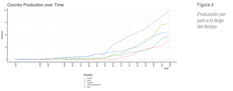 El Reino Unido fue pionero en estas áreas con su primera publicación en 2003, y llegó a alcanzar 56 artículos en 2022. Sin embargo, Estados Unidos lo superó en 2006 y ha mantenido su liderazgo, incluso alcanzó 99 publicaciones en 2022. Italia, que comenzó en 2009, creció significativamente desde 2014, mientras que Turquía mostró un rápido crecimiento desde 2012 y China, desde 2015.