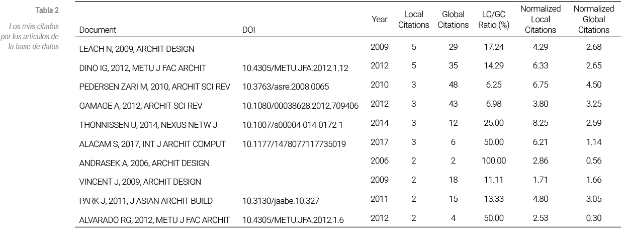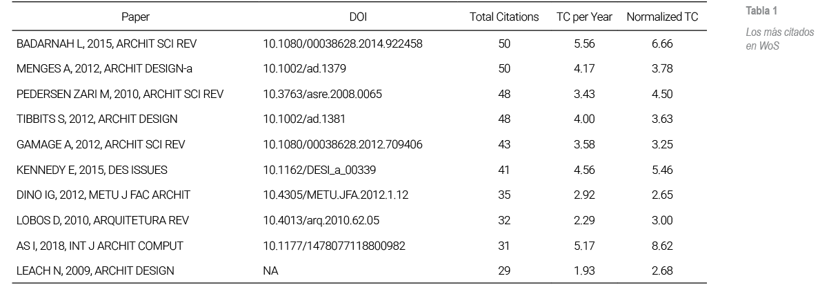 Los artículos más citados promedian entre 2 y 5,56 citas por año, con una normalización de citas entre 2,68 y 8,62, lo que refleja tanto su relevancia científica como el carácter interdisciplinario de las investigaciones en diseños computacional y biomimético. Las revistas Architectural Science Review y Architectural Design dominan entre los documentos más citados, subrayando su prestigio y la importancia de estos temas en la investigación arquitectónica actual.