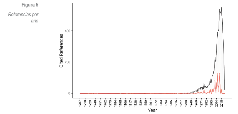 El análisis de las referencias por año muestra un aumento constante en el número de citas y referencias entre 2000 y 2006, con un pico en 2006 y una posterior disminución a partir de 2018. Este descenso en el número de citas puede atribuirse a la rápida obsolescencia de algunos estudios debido a los avances tecnológicos que superan los enfoques utilizados en trabajos previos. En 2022, por ejemplo, solo se registraron 20 referencias, lo que refleja esta tendencia hacia la obsolescencia de trabajos anteriores.