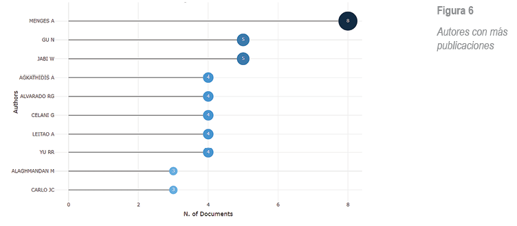Entre otros autores destacados, se incluyen a Gu, Jabi y Agkathidis, quienes han contribuido significativamente con 5, 5 y 4 artículos, respectivamente. Estos investigadores se han enfocado en la integración de la tecnología digital en el proceso de diseño arquitectónico, y su trabajo ha abordado temas como la generación de formas arquitectónicas mediante algoritmos y la interacción entre herramientas digitales y métodos tradicionales. Su influencia en el campo también se refleja en sus índices de citación, pues Gu y Jabi mantienen un índice h de 3 y 4, respectivamente.
