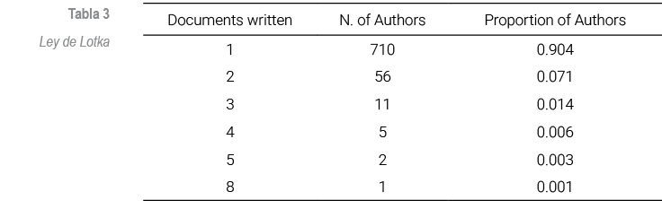 La Ley de Lotka (Tabla 3), aplicada a este conjunto de datos, muestra que la mayoría de los autores ha contribuido solo con un artículo. De hecho, el 90,4 % de los autores ha publicado un solo documento, mientras que un pequeño porcentaje ha publicado más de un trabajo. Solo un autor, Menges, ha alcanzado un total de 8 artículos, lo que lo sitúa en un 0,1 % de la producción total. Esta concentración en unos pocos autores refleja la tendencia observada en otros campos científicos, donde una minoría de investigadores realiza la mayoría de las publicaciones.