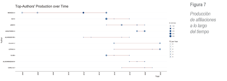 Como muestra la Figura 7, la producción por afiliaciones se concentra en los años recientes, evidenciando una incorporación progresiva de nuevas instituciones y un crecimiento acumulativo del campo a partir de la segunda mitad de la década de 2010.