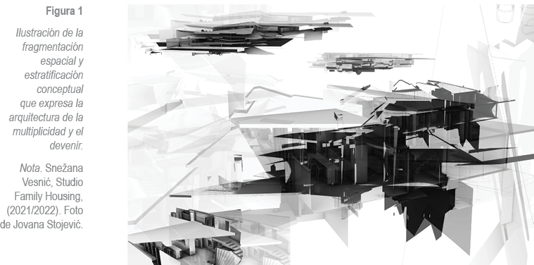 La filosofía del devenir de Deleuze desestabiliza radicalmente la noción de arquitectura como algo estático o finito (Deleuze & Guattari, 1980/1987). En lugar de entender la forma como un estado cerrado, enfatiza su carácter procesual y contingente. La arquitectura, leída a través del lente deleuziano, se convierte en un espacio de morfogénesis constante, donde la interacción de fuerzas produce variaciones infinitas. En El pliegue. Leibniz y el Barroco, Deleuze presenta el pliegue como un principio de transformación continua, en el que interior y exterior se interpenetran, donde la forma y la materia, lo finito y lo infinito, se modulan sin cesar, sin reducirse el uno al otro (Deleuze, 1988/1993, p. 14). El pliegue sugiere un proceso de diseño donde los espacios no se conciben como fijos, sino como territorios continuamente negociados, generadores de formas emergentes que resisten el cierre. La morfogénesis se convierte en una serie infinita de experimentaciones, una danza entre la forma y lo informe, siempre inconclusa, pero profundamente generativa.