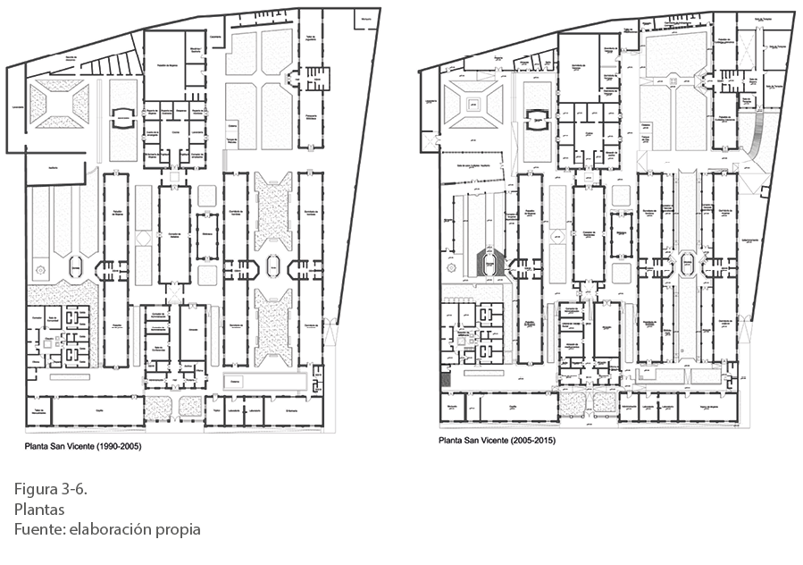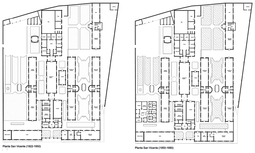 Es por eso que, luego del análisis realizado, se han encontrado cuatro etapas del complejo desde su creación hasta el día de hoy. En un comienzo, eran evidentes los ejes principales y secundarios que planteó Marquina para dividir los sectores de administración y residencia de mendigos. Ya para el año 1950, se construye dentro del complejo un pabellón en donde vivían monjas cuyo servicio de caridad permitió brindar apoyo a los residentes de la época. Como tercera etapa, y ya entrando al siglo XXI, era claro que las intervenciones contemporáneas empezaron a aparecer, y es que además de realizarse una pequeña ampliación de terreno hacia el lateral izquierdo, los nuevos pabellones construidos, como lavandería, una sala multiusos y una biblioteca, ya pierden relación en cuanto altura y estética en comparación con los demás edificios en conjunto. Finalmente, ya en la actualidad y con el cambio de denominación de residencia a hogar geriátrico, el San Vicente de Paúl ha tenido que adecuar nuevas áreas de atención al residente para brindar no solo hospedaje, sino además un servicio de terapias. Esto ha traído
