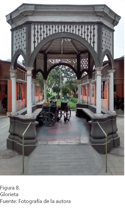 organizando los volúmenes en ejes longi-tudinales y cuerpos transversales, que permiten separar y jerarquizar ambientes. El eje central-principal divide los sectores de mujeres y de hombres; mientras que los ejes secundarios, paralelos al principal, permiten tener dos volúmenes más en el área de varones y solo uno en el de mujeres. En cuanto a los cuerpos transversales, estos se definen por tres áreas. En el primero se encuentra la capilla y un área pequeña destinada actualmente para mortuorio; en el segundo cuerpo encontramos la administración; mientras que en el tercero están los talleres para terapia y servicios. Estos volúmenes, a la vez, se han ido expandiendo y modificando a lo largo de los años, por lo que actualmente se pierden estos tres últimos ejes mencionados.