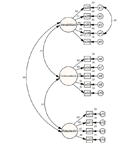 En seguida, se calculó el coeficiente de correlación r de Pearson entre la puntuación de las tres facetas obtenidas de la flexibilidad. La tabla 3 muestra que los factores se correlacionan de forma positiva y estadísticamente significativa. La amabilidad correlaciona significativamente con la condescendencia y con la adaptación conductual, en la misma dirección y en menor magnitud con la adaptación conductual. Esta última faceta de la flexibilidad se relacionó positiva, significativamente y con similar magnitud con la amabilidad y la condescendencia. Los niveles de correlación permiten asumir que son dimensiones cercanas entre sí y posibles rasgos cardinales en nuestro país.