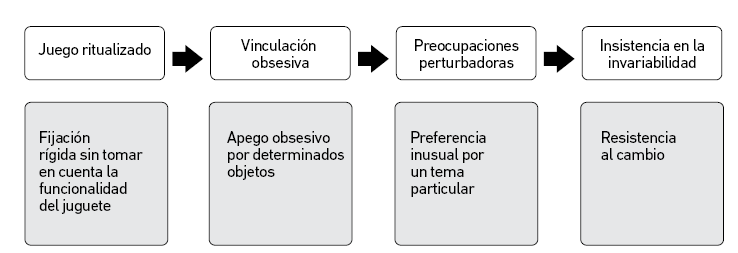 En el caso de los niños con TEA, se puede observar principalmente conductas ritualistas que se mantienen fijas en el tiempo y se ejecutan de manera habitual sin modificaciones o alteraciones. Estos niños mantienen una posición rígida y poco convencional. Rutter (1978, como se cita en López & García, 2007) plantea cuatro conductas ritualistas (véase la figura 2).