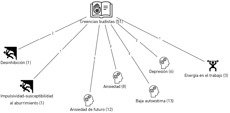 Como vimos anteriormente en los resultados cualitativos, las creencias budistas también se encuentran asociadas en menor medida con cambios positivos en neuroticismo-ansiedad, ansiedad de futuro y actividad, así como cierta conexión con la capacidad de regulación de cuestiones relacionadas con el rasgo de impulsividad-búsqueda de sensaciones. La cosmovisión budista en la que entra el practicante —karma, reencarnación, búsqueda de la felicidad a través de la budeidad, entre otras— posee ciertas particularidades que permean todo el proceso de conversión e influencian en gran medida, en primer lugar, en la autoestima y la ansiedad, dada la capacidad percibida de control del practicante sobre su vida, a través de la minimización del karma y el compromiso con el camino budista; en segundo lugar, en su temporalidad subjetiva, en tanto los acontecimientos futuros se vuelven más “manejables” y, por tanto, menos negativos o ansiogénicos, a la vez que la muerte ya no es más el final de una línea recta sino un punto más dentro un círculo; y, en tercer lugar, en el estado de ánimo, ya que la persona adquiere un mayor optimismo frente a la vida, así como tiene una mayor capacidad para dar sentido a los eventos trágicos de la misma.