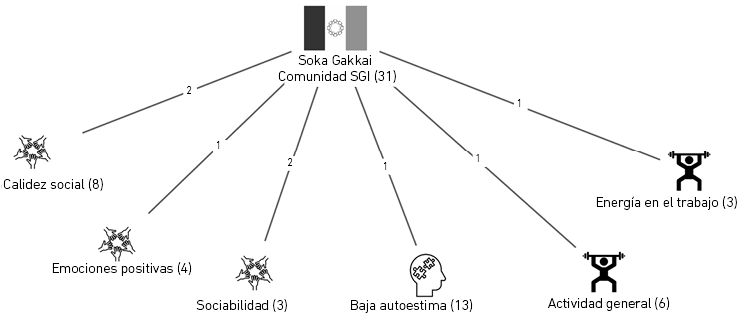 Finalmente, la comunidad de la SGI también podría incidir en los cambios de personalidad, principalmente aquellos vinculados con el rasgo sociabilidad-extraversión, si tomamos en cuenta su mayor presencia en el análisis cualitativo de las intersecciones de códigos. La comunidad de la USGI se ofrece como una red social de contención y ayuda entre pares. Los miembros manifiestan que las reuniones de diálogo serían instancias similares a una “psicoterapia grupal”, donde pueden compartir y elaborar problemas personales desde el punto de vista de una ética y una cosmovisión budistas. A su vez, la SGI como organización mundial da a los participantes un sentido de pertenencia y un propósito común expresados con el término itai doshin. Dentro de esta comunidad de pertenencia, la figura de Daisaku Ikeda cobra un rol protagónico, en tanto maestro budista en un sentido japonés, esto es, un senséi (literalmente 'quien ha nacido antes'), alguien que ha recorrido ya el camino, ha alcanzado la sabiduría y se ofrece como figura ejemplar a un “nosotros” que manifiesta un vínculo no solo general, sino también íntimo con Ikeda.