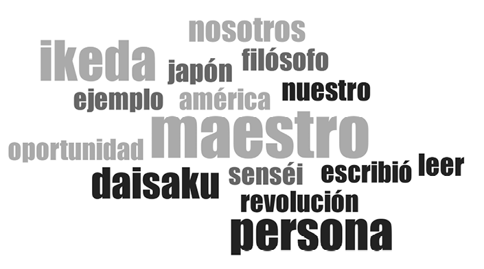 Nociones como el kosen-rufu (el logro de la paz mundial a través de la felicidad individual) y el shakubuku (transmisión de la ley mística a otros) son entendidas usualmente en la interacción cotidiana y le dan sentido al establecimiento de vínculos con los demás como parte de la búsqueda de la felicidad de todos los seres humanos. Por último (pero no menos importante), está la figura del senséi Daisaku Ikeda, que se presenta como un maestro, pero también como un par budista, que brinda su testimonio de vida sobre la efectividad del budismo Nichiren. Tomando los fragmentos donde los miembros entrevistados describen y valoran a Ikeda, podemos ver en la nube de palabras (Figura 6) una mayor recurrencia de palabras como maestro/senséi (20+5 veces), así como persona (16 veces), ejemplo (7 veces) y filósofo (6 veces). La designación de maestro es común a toda la SGI, y también el entenderlo como persona, en tanto es un budista más que predica con su ejemplo de vida. El nosotros, nuestro y oportunidad (de conocerlo en persona), marca la importancia de un sentido de pertenencia y una relación personal con la figura de Ikeda como maestro. La importancia de la difusión del budismo (escribió-leer; Japón-América) y su planteo de revolución humana aparecen también en forma recurrente.